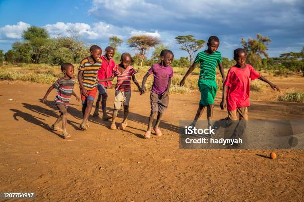 African children from Masai tribe playing football in the village near Mount Kilimanjaro, East Africa, Kenya, East Africa. Maasai tribe inhabiting southern Kenya and northern Tanzania, and they are related to the Samburu.